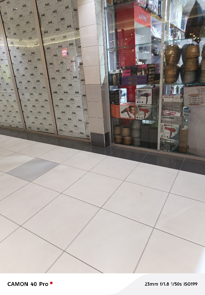 A storefront displays various products behind a glass window, including hair dryers, hair care products, and decorative pots or containers stacked in the center. The storefront's window is partially covered with branding materials. The floor is tiled with square white tiles and dark grout lines. The camera's information, "CAMON 40 Pro," and "23mm f/1.8 1/50s ISO199," appear at the bottom of the image.