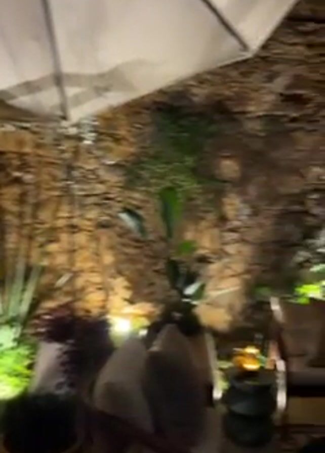 n outdoor seating area at night, likely a restaurant or bar. There are several tables and chairs arranged under large umbrellas. The area is lit with small, warm lights and there is a stone wall with plants behind the seating. No people are visible. The camera slowly pans across the scene.