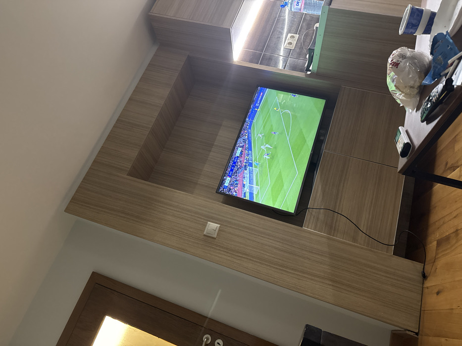 The image depicts the interior of a modern living space, identified as being in Sofia, Bulgaria, by a "DEVA" brand water bottle visible on a counter. A flat-screen television is centrally positioned within a light-brown wooden entertainment unit, displaying a soccer match featuring multiple players on a green field. To the left, a partially visible wooden door with a translucent illuminated panel and metallic handle is present. A white electrical light switch is mounted on the wooden paneling to the left of the television. To the right of the television, a kitchenette area with matching wooden cabinetry and an under-cabinet light illuminates a tiled backsplash, which includes a dual electrical outlet. In the foreground, a dark-topped coffee table holds at least two remote controls, a white plastic bag, a partially visible white and blue cup, and several wrappers. A black power cable extends from the television down to the light-colored wooden floorboards. The walls are light-colored, and the ceiling is white. No individuals are visible.