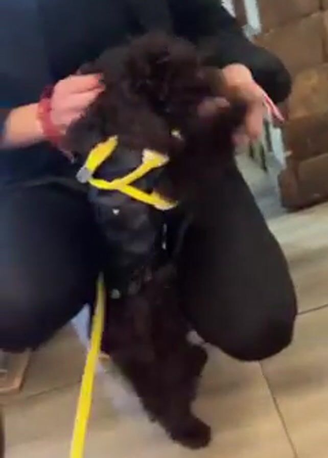 person kneeling on a tiled floor, holding a small, black, curly-haired dog