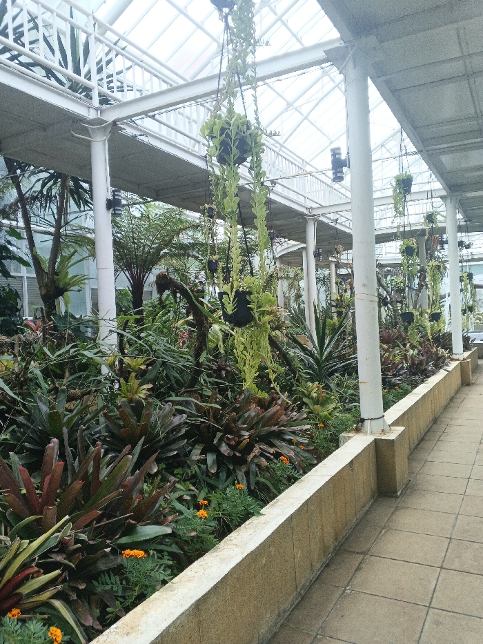 The scene depicts an interior view of a botanical garden or greenhouse located in Munyati, Zimbabwe. A tiled pedestrian pathway, composed of light brown square tiles, extends from the foreground into the background along the right side of the frame. This pathway is bordered on its left by a low, light beige concrete wall, approximately 0.5 meters high. To the left of the wall, a densely planted garden bed features a variety of tropical and subtropical vegetation. Prominent subjects include numerous bromeliads with broad, green and reddish-green leaves occupying the foreground and midground. Smaller plants with orange flowers, resembling marigolds, are interspersed at the base of the larger foliage. In the background, taller plants and fern-like trees are visible. Overhead, a white metal structural framework supports a translucent roof, allowing ambient light to illuminate the space. White cylindrical pillars extend vertically from the ground, supporting the overhead structure. Several black hanging planters, each containing long, trailing green succulent-like plants, are suspended from this framework. Black wall-mounted lighting fixtures are attached to some of the white pillars. No individuals are present in the image.