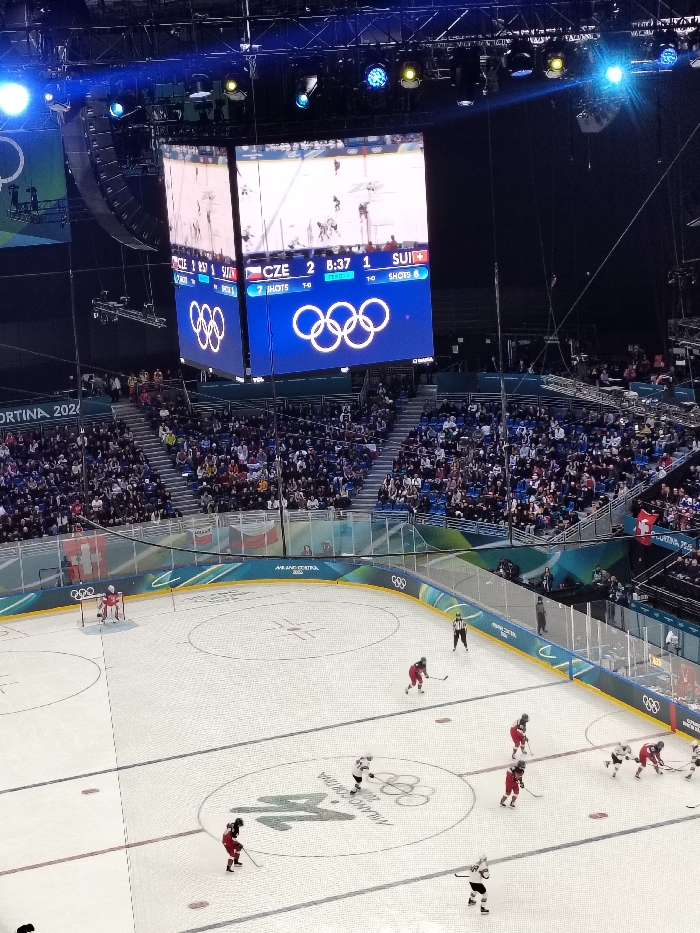 - "This image captures an ice hockey game in progress within a large indoor arena in Milan, Italy, specifically identified by "MILANO CORTINA 2026" branding on the jumbotron and rink boards, indicating a connection to the future Olympic Games" by FM-5zIUy2, licensed under CC BY 4.0