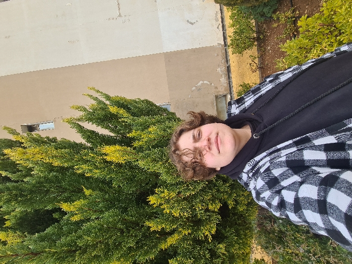 A person stands outside, framed by a building and greenery. The person wears a black hooded sweatshirt under a white and black checkered flannel shirt. They have curly brown hair and a relaxed expression. Lush green bushes and trees with hints of yellow surround them on one side. A tall, light-tan building forms the backdrop on the other side.