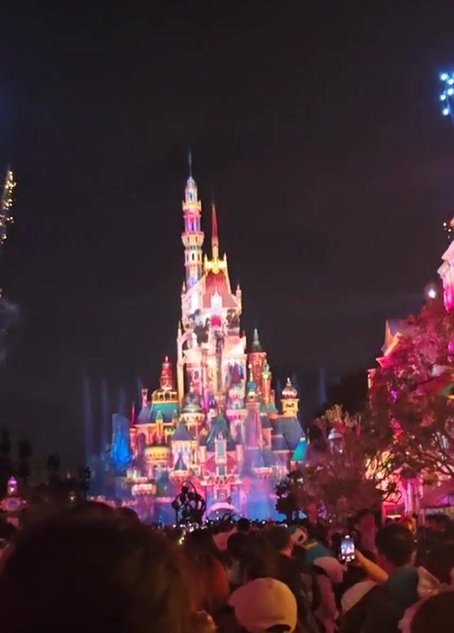 colorful castle at night surrounded by a large crowd of people. The castle is brightly lit with a variety of colors, and there are fireworks going off in the background. Many people are holding up their phones to take pictures. The sky is dark and clear.