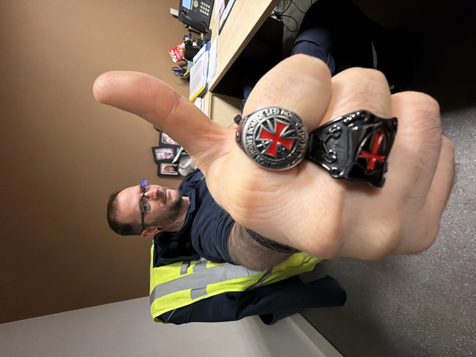 The image depicts an indoor office environment in Grevenmacher, Luxembourg. An adult male, of apparent Caucasian ethnicity, is seated in a dark grey office chair, positioned behind a light brown wooden desk. He has short brown hair, a short beard, and wears dark-rimmed eyeglasses and a dark blue polo shirt. A black ear gauge is visible in his left ear, and a tattoo is present on his right forearm. A high-visibility yellow and grey vest is draped over the back of his chair. The male extends his right hand towards the camera in a thumbs-up gesture, prominently displaying two metallic rings. The ring on his right thumb features a circular face with a red cross on a white background, encircled by the inscription "NON NOBIS DOMINE SED NOMINI TUO DA GLORIAM." A second, darker metallic ring with an ornate design and a smaller red cross emblem is visible on an adjacent finger. The male looks towards the camera with a slight smile. The background consists of a light brown wall. On the desk to the right, a black desk phone, stacks of paper documents, a container of red-packaged snacks, and several framed photographs are visible. A black waste bin is positioned to the left of the chair. The floor surface is grey.