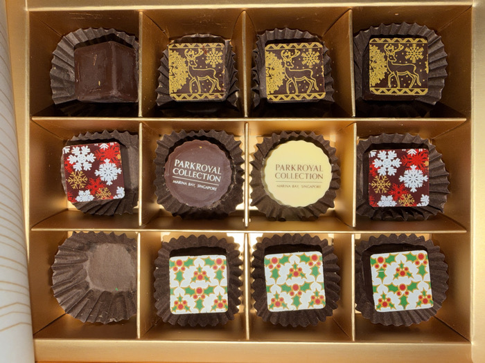 An overhead shot reveals an open, gold-colored box of twelve chocolates, with one chocolate missing from the bottom-left compartment. The box has three rows and four columns, each compartment containing a dark brown fluted paper cup. The top row contains four square chocolates: one plain dark brown chocolate on the far left, and three identical square chocolates to its right, each decorated with a gold reindeer and snowflake pattern on a dark brown background. The middle row contains four chocolates: two square chocolates, one on each end of the row, both decorated with a red, white, and gold snowflake pattern on a dark brown background. Between these are two identical round chocolates, each featuring the text "PARKROYAL COLLECTION" and "MARINA BAY, SINGAPORE" printed on a light cream-colored circular label. The bottom row contains three square chocolates to the right of an empty brown paper cup. These three chocolates are identical, each decorated with a green holly leaf and red berry pattern on a white background. The box interior walls are golden, with the left wall displaying a faint, diagonal striped pattern. The scene depicts a festive-themed chocolate assortment associated with the PARKROYAL COLLECTION hotel in Marina Bay, Singapore.