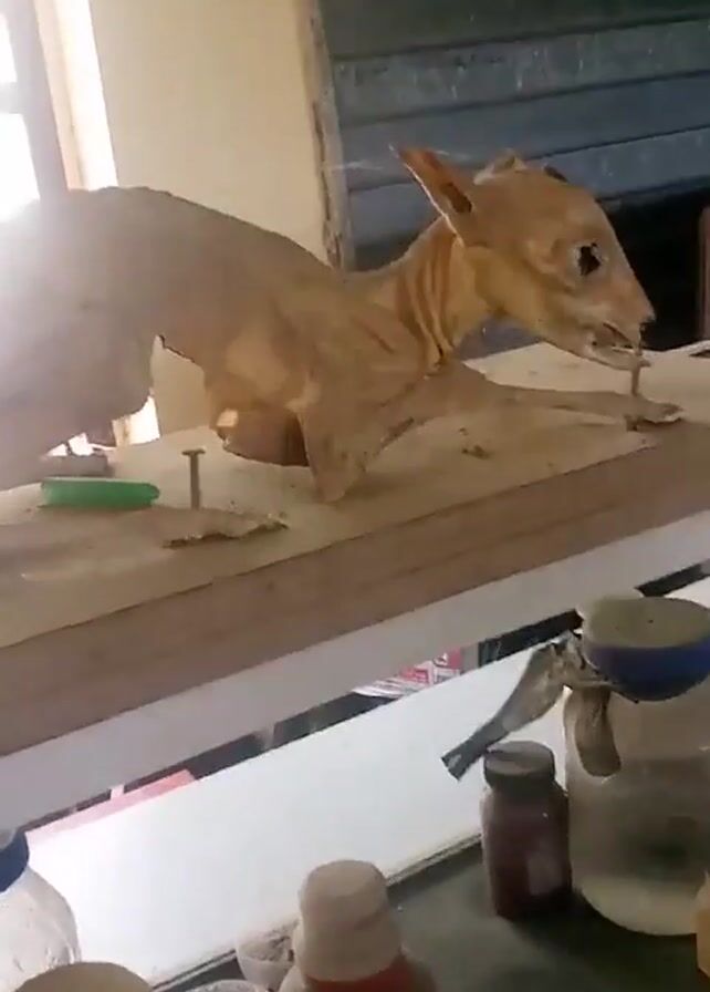taxidermied animal, possibly a dog or fox, on a shelf