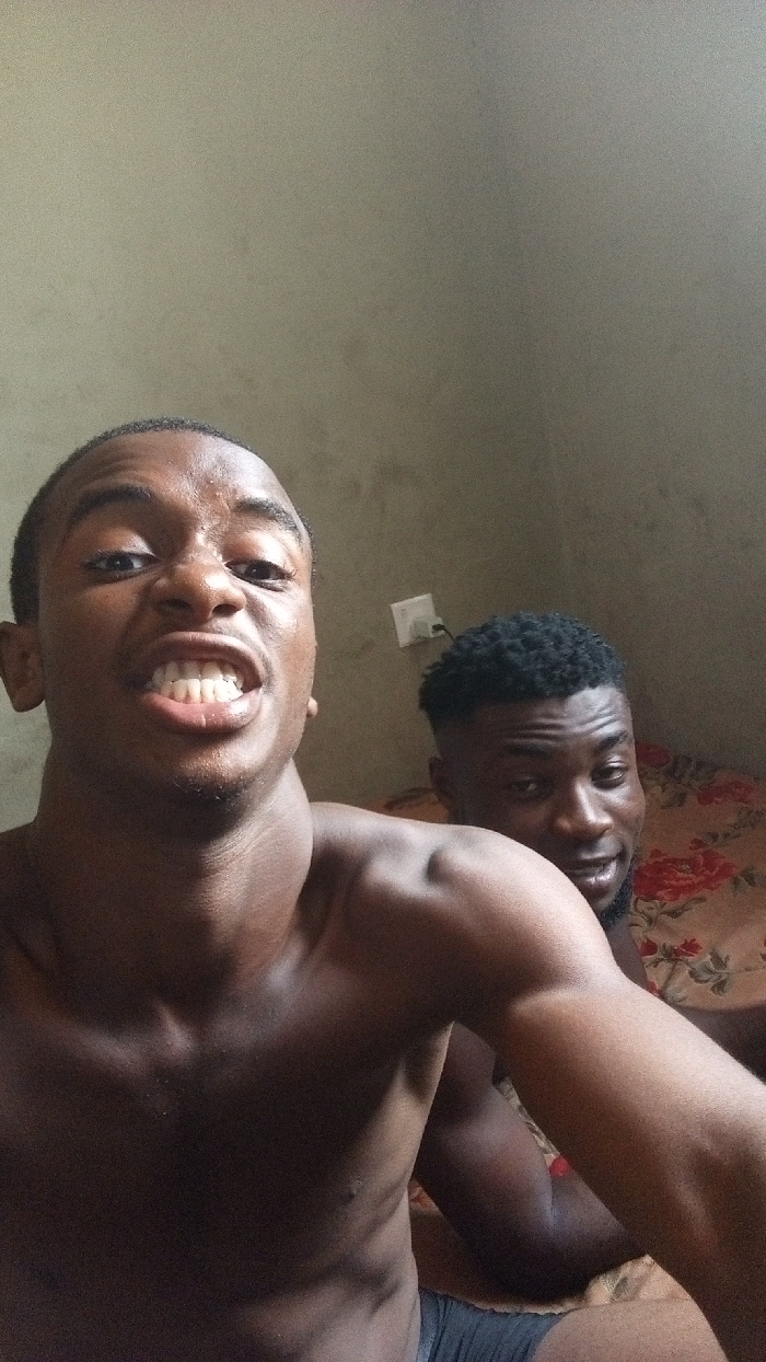Two dark-skinned men, shirtless, are in a room. The man in the foreground is closer to the camera, baring his teeth. His facial expression is intense. He has a low haircut. Behind him, a second man with a close-cropped afro peeks from behind him with a faint smile. A floral patterned bedspread is visible. An electrical outlet is seen on the wall in the background.