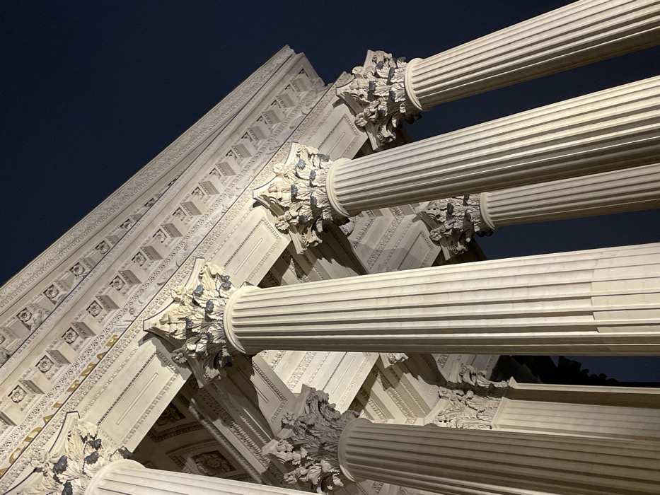 - "The image displays a low-angle, upward-looking view of the illuminated neoclassical facade of the Panthéon, located in the Latin Quarter of Paris, France" by FM-VHE4f2, licensed under CC BY 4.0