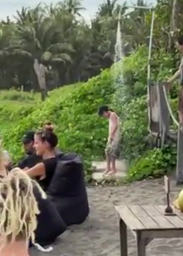 beach scene on a cloudy day. In the foreground, several people are seated in black beanbag chairs, possibly at an outdoor bar or lounge area. A small wooden table with a coconut on it stands nearby. Behind the seated people, a young person wearing a light-colored dress or garment is standing under an outdoor shower. The shower has a strong stream of water pouring down. A woman in a black tank top and brown fringed skirt is standing on a raised wooden platform next to the shower structure. The background includes dense green vegetation, palm trees, and a glimpse of the beach. The ground is dark, likely black sand. There is a low whirring sound in the audio, possibly an appliance or vehicle noise.