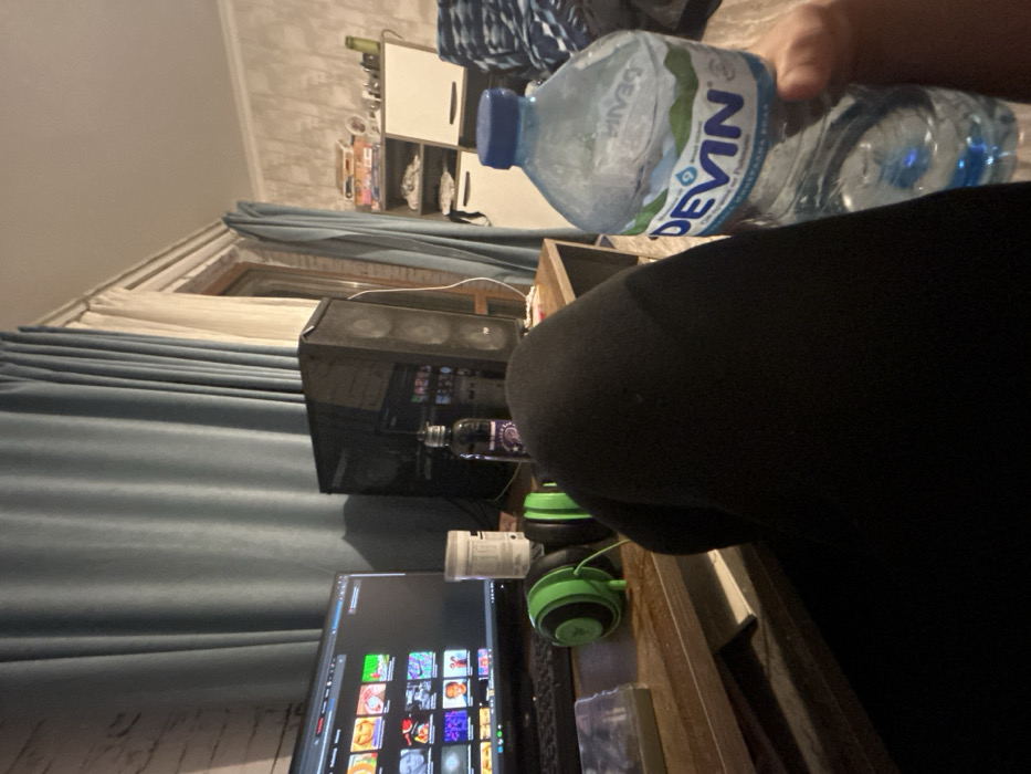 The image displays an indoor scene within a residential room in Burgas, Bulgaria, viewed from a seated, first-person perspective. The lower-center and right of the frame are occupied by a person's left leg, clad in black fabric, and their right hand, holding a clear plastic bottle of "DEVIN" mineral water with a blue cap, exhibiting condensation. A wooden desk extends across the mid-ground. On the desk, a desktop computer monitor displays a grid interface of colorful video thumbnails. A black keyboard is partially visible below the monitor. To the right of the keyboard, a pair of green and black over-ear headphones are placed. Further right, a dark-colored personal computer tower with visible internal fans stands adjacent to a dark-colored bottle with a purple label and a white cylindrical container. A flat, rectangular object, possibly a book, is located on the far left of the desk. The background features light blue curtains, with a lighter-colored curtain or sheer visible behind them on the left. A light-colored, textured wall is visible to the far left. To the right, a white and light brown shelving unit, containing various items including stacked boxes, is positioned against a different light-colored, patterned wall. A white cabinet or small refrigerator is situated beneath the shelving unit. The room is illuminated by artificial light.