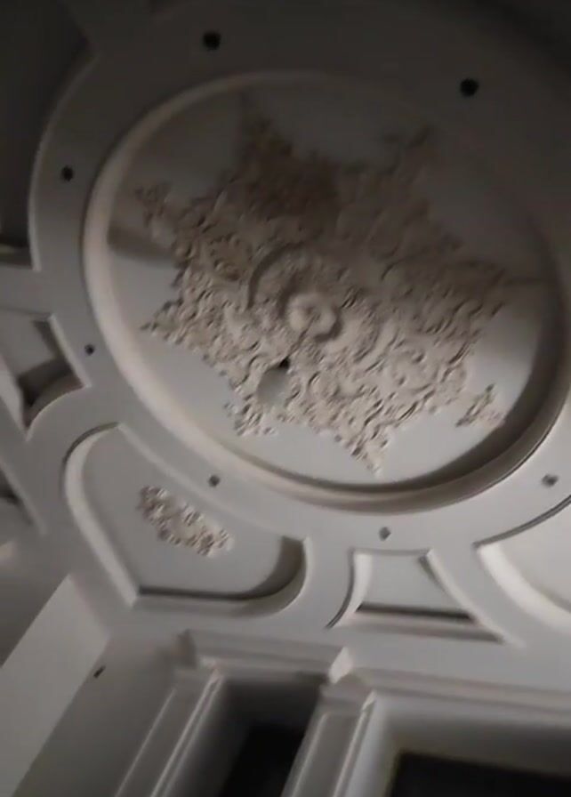 low-angle view of a white ceiling with elaborate decorative moldings. The ceiling features a large, circular recessed section in the center, adorned with ornate plasterwork. Smaller, similarly decorated sections are visible in the surrounding areas. There are also several small, dark circular spots in the ceiling, possibly light fixtures. The video appears to be taken indoors. The lower portion of the frame reveals elements of wall paneling and a framed object.