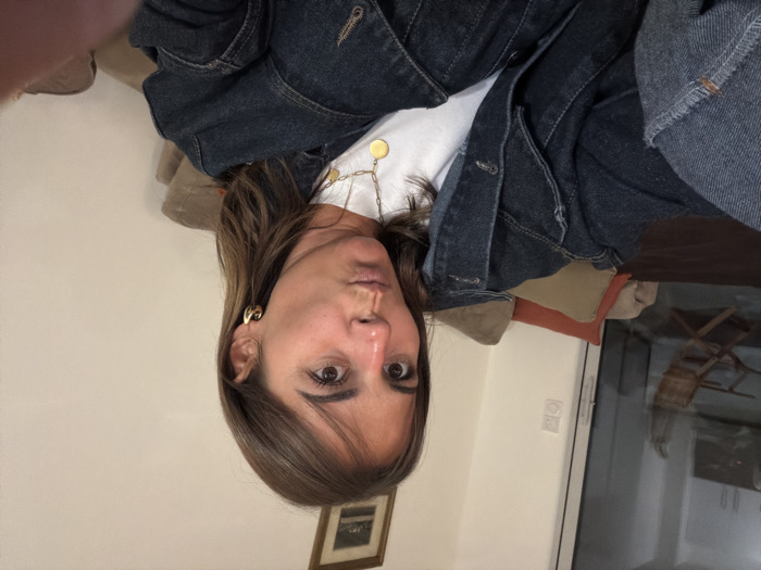 A woman poses for a selfie, looking directly at the camera with pursed lips. She wears a white t-shirt, a dark blue denim jacket, and gold jewelry, including a necklace and earrings. The background shows a beige wall with a framed picture, a door, and pillows. The photo is rotated 180 degrees.