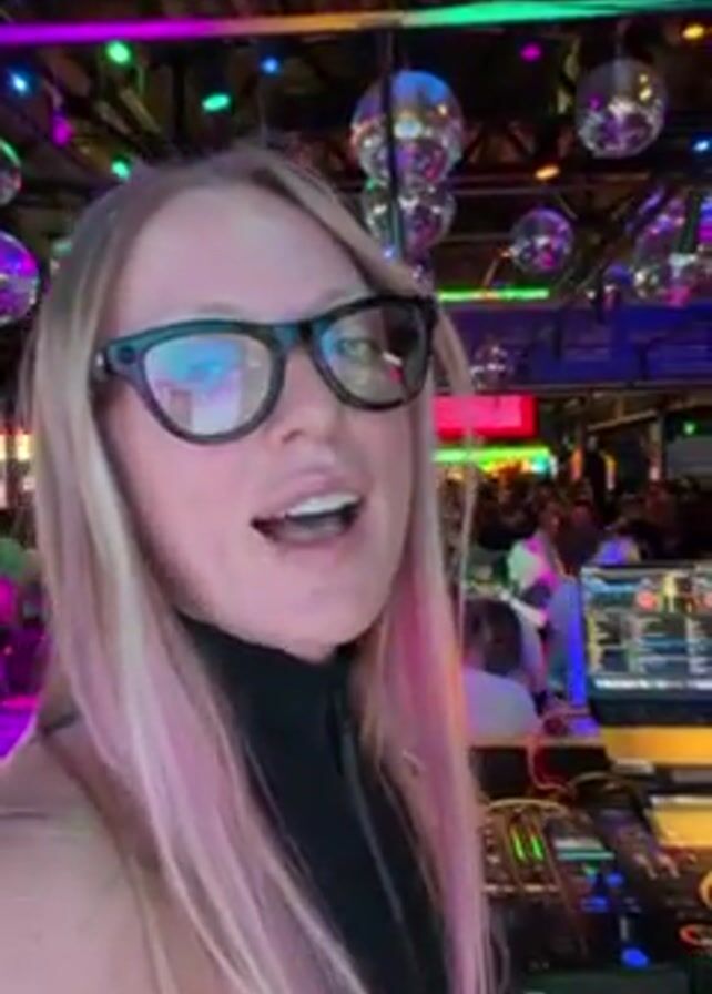 A woman with shoulder-length blonde hair with pink streaks and black framed glasses is standing behind a DJ table in a crowded bar/club