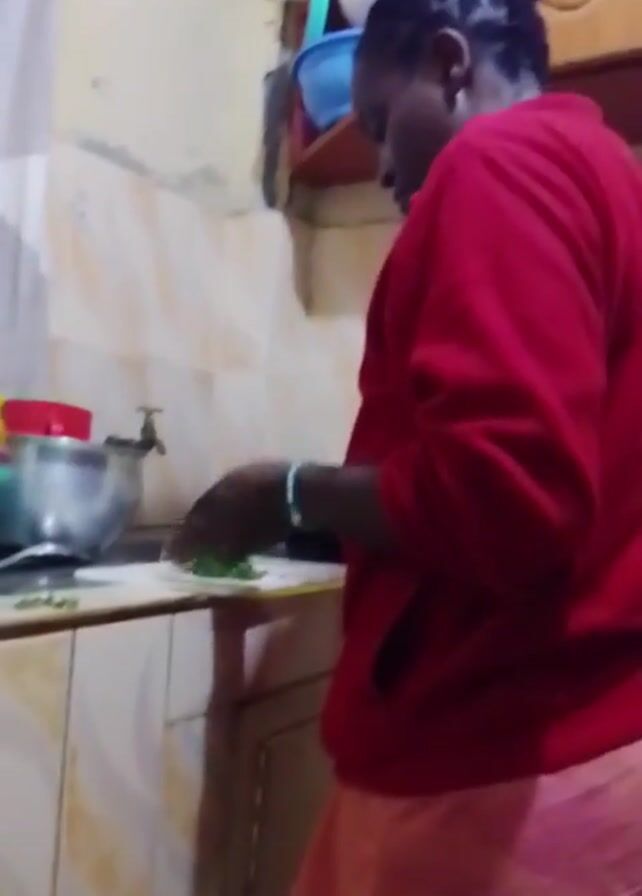 A person in a red sweater and pink shoes stands in a small kitchen. They are at a countertop with a green bowl, and a metal bowl with red lid on it. The person is washing something under the faucet. To the right of the countertop, there is a red gas stove where a pan with cooked food is sitting, and a wooden spoon is resting on the pan. There are two metal tanks of cooking gas on the floor, as well as a green plastic bag and bottles of soda. The walls are painted white with tan and orange tiles.