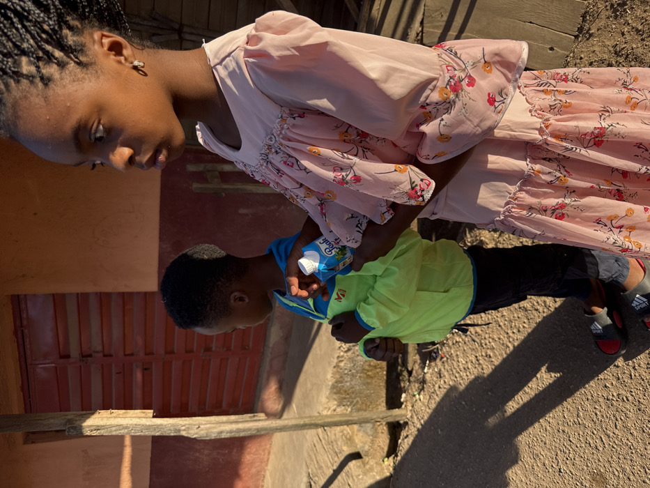 In Jos, Nigeria, two children stand outdoors on an uneven, light-colored paved surface, casting long shadows indicative of low sun angle. To the right, an African girl, approximately 8-12 years old, is depicted in profile, looking towards the right and slightly upward with a contemplative expression. She has braided dark hair and wears a small silver-colored hoop earring. Her attire is a light pink long-sleeved dress adorned with a floral pattern featuring orange, red, and green blossoms, characterized by puffed sleeves and ruffled tiers. Her right hand centrally holds a small white carton of "Peak" milk. To the left, a younger African boy, approximately 4-7 years old, stands slightly behind the girl, facing left. He has short dark hair with a distinct bleached section on the back of his head. He wears a neon green and blue partial-zip jacket with "MI" branding, dark trousers, and black and red "SPORT" slides. His left hand is raised near the milk carton held by the girl. The immediate background features a rough wooden post on the far left, followed by an orange-brown wall, and a prominent, closed, horizontally paneled red-brown metal door or shutter. Minor debris is visible on the ground near the wall.