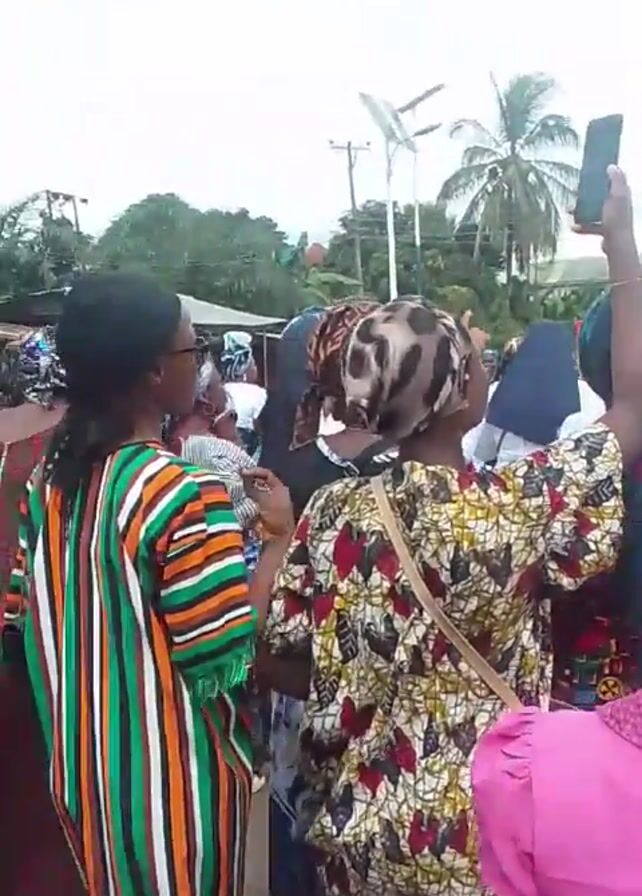 A crowd of people is gathered, mostly women. Many are wearing colorful, patterned clothing and head coverings. Some are holding up their phones, possibly recording or taking pictures. There is music playing, including a drum. The scene takes place outdoors in what appears to be a town or city, with trees and buildings visible in the background, along with streetlights.
