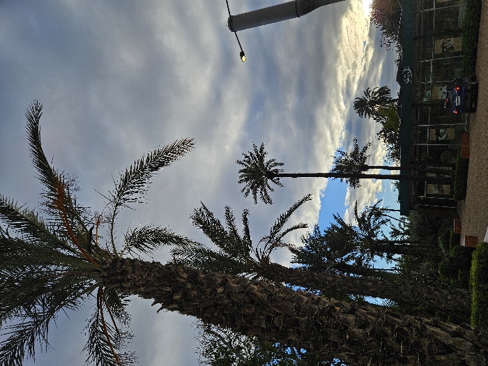 Palm trees occupy the foreground, their fronds reaching towards a cloudy sky. A building stands to the right, partially obscured by foliage. A car is parked in front of the building. A vertical light fixture cuts across the top of the frame. The sky is a mix of dark clouds and patches of bright light. The image is vertically oriented.