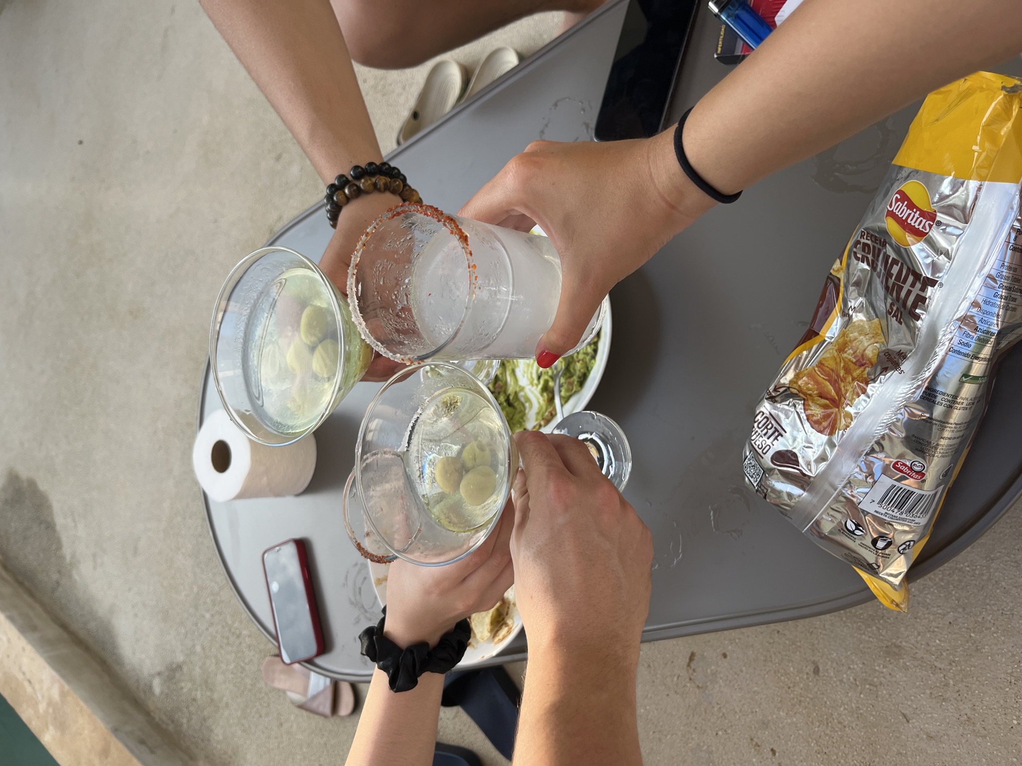 The image captures a social gathering, presumably a celebration, taking place outdoors, characterized by a concrete floor. Four individuals are captured from a top-down perspective, their hands meeting in the center of the frame to clink glasses. Each glass contains a clear liquid, with three containing olives. One glass is being poured into other glasses. One of the glasses is rimmed with a reddish-brown substance, possibly Tajin. Two hands have bracelets, one black, one with beads. A bag of Sabritas "Receta Crujiente Corte Queso" chips sits to the right, along with a lighter and an unidentified black object. A roll of toilet paper and a cell phone are also visible on the table. A white plate contains a green substance, likely guacamole or salsa. The image is shot from above, with the gray table centrally located in the frame. The text visible on the chips bag indicates it is likely in Mexico. Given "Brisas de Zicatela, Mexico" the setting is likely a patio or outdoor dining area.