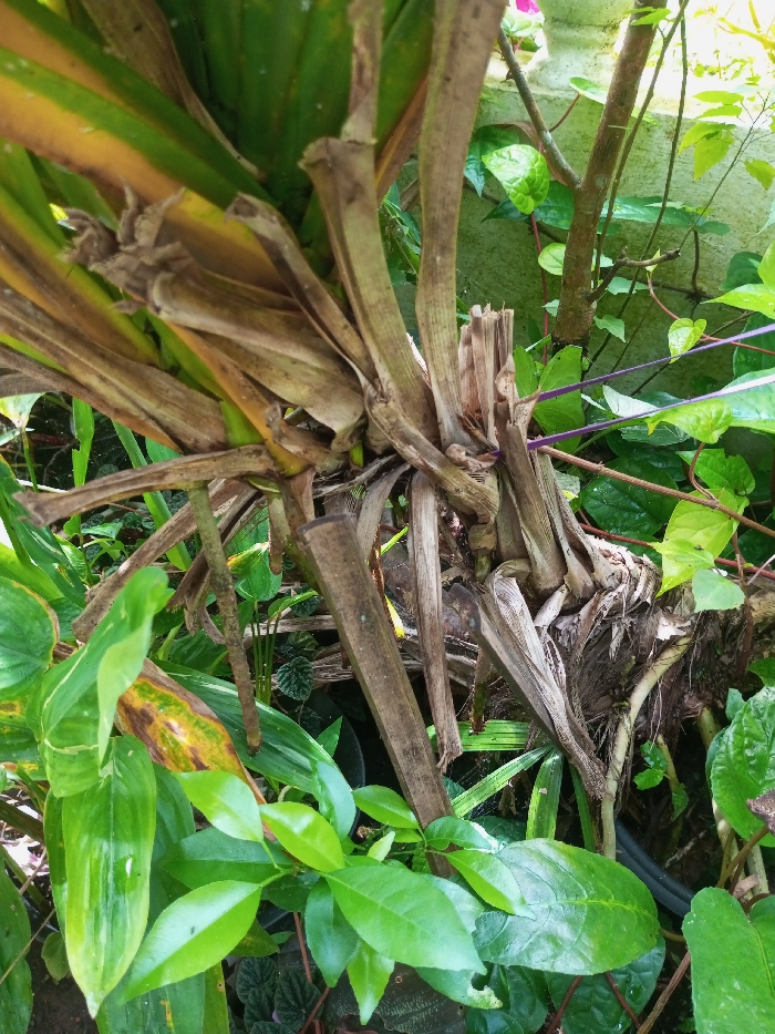 The image captures a dense botanical scene in Mindat, Myanmar. The central subject is a cluster of thick, dry, fibrous plant stems, primarily brown and tan, exhibiting signs of desiccation and decay. Emerging from and surrounding this core are various green leaves, some vibrant and glossy, others displaying yellowish-brown discoloration. In the upper right background, a section of a light-colored wall or structure is visible, partially obscured by green foliage and slender branches. A distinct purple strap or cord is horizontally oriented across the mid-right, threaded through the dense greenery. No individuals or animals are present.