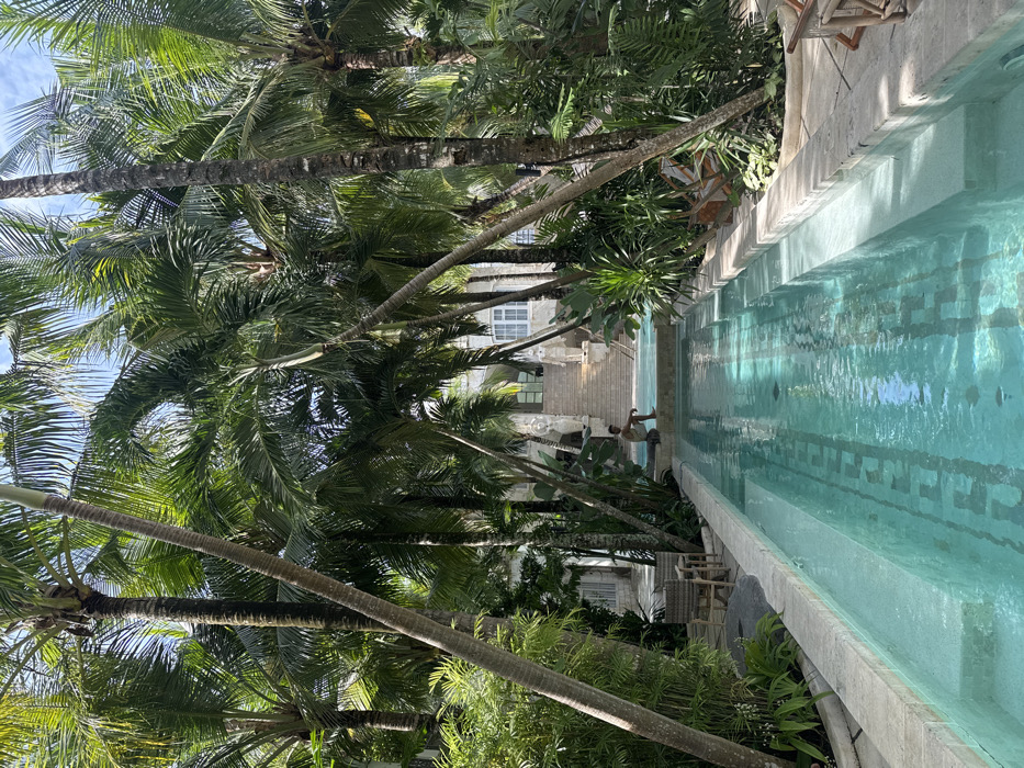 A long, rectangular pool glistens with turquoise water, bordered by a concrete edge. Palm trees frame the scene, their fronds casting dappled shade. A person stands at the edge of the pool, seemingly taking a photo. Buildings are visible behind the foliage. Lounge chairs and greenery complement the tropical ambiance. The image is rotated, resulting in a vertically oriented composition.