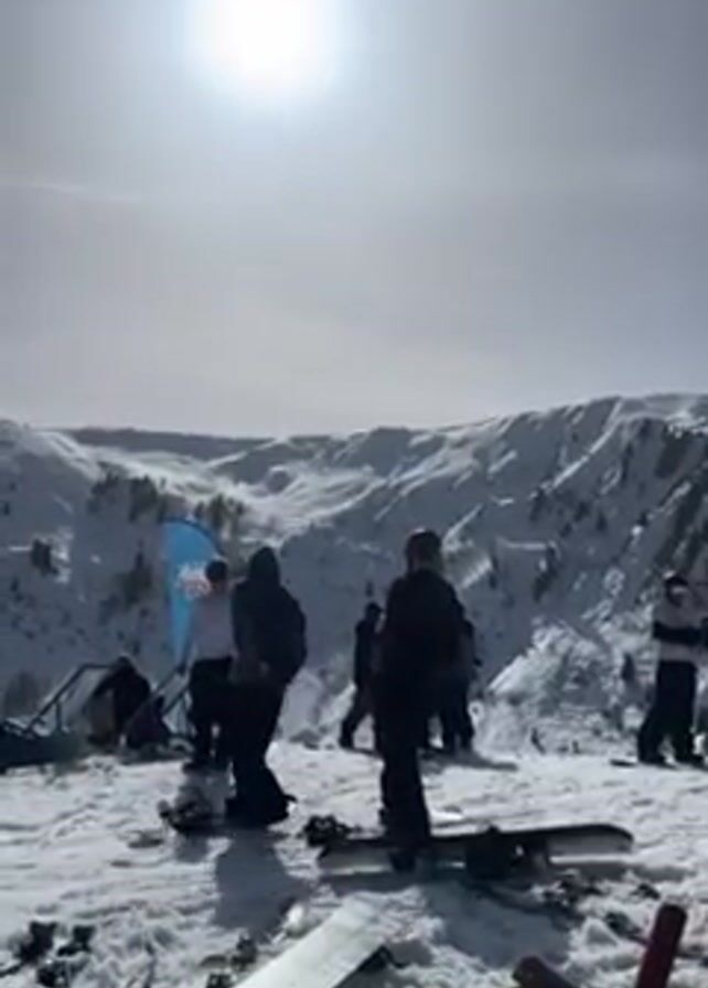 sunny, snow-covered mountaintop. Several people are standing or sitting on the snow. Some appear to be skiers or snowboarders. Ski equipment is lying on the ground. There is a blue flag with writing on it. In the background are snow-covered mountains and some trees. The sun is high in the sky.