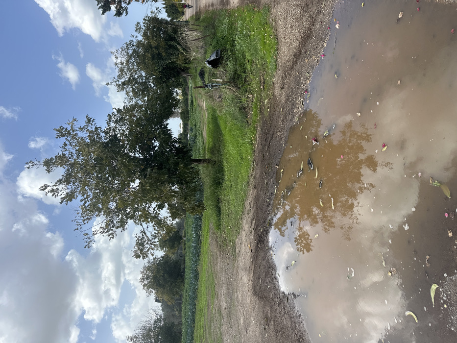 The image depicts an outdoor agricultural environment in Beit Yitshak Sha'ar Hefer, Israel, under a partially cloudy blue sky. In the foreground, a large, irregular-shaped puddle of turbid brown water occupies the lower half of the frame. The puddle's surface reflects the sky and a nearby tree, and contains numerous floating organic debris, including light green vegetable scraps and reddish-pink petals. A dirt path extends from the foreground along the right side of the image, leading into the midground. To the left of this path, a cultivated field of dense green crops, possibly leafy vegetables, spans the midground. A deciduous tree with dark green foliage stands prominently in the center-left midground. To the right of the dirt path, a weathered fence line is visible, along with overgrown vegetation and a broken black plastic object. In the distant midground, along the dirt path on the far right, a single individual is observed riding a bicycle away from the viewer. The background features a treeline, with additional trees and a faint, light-colored structure on the distant horizon to the left. The sky displays scattered white cumulus clouds.