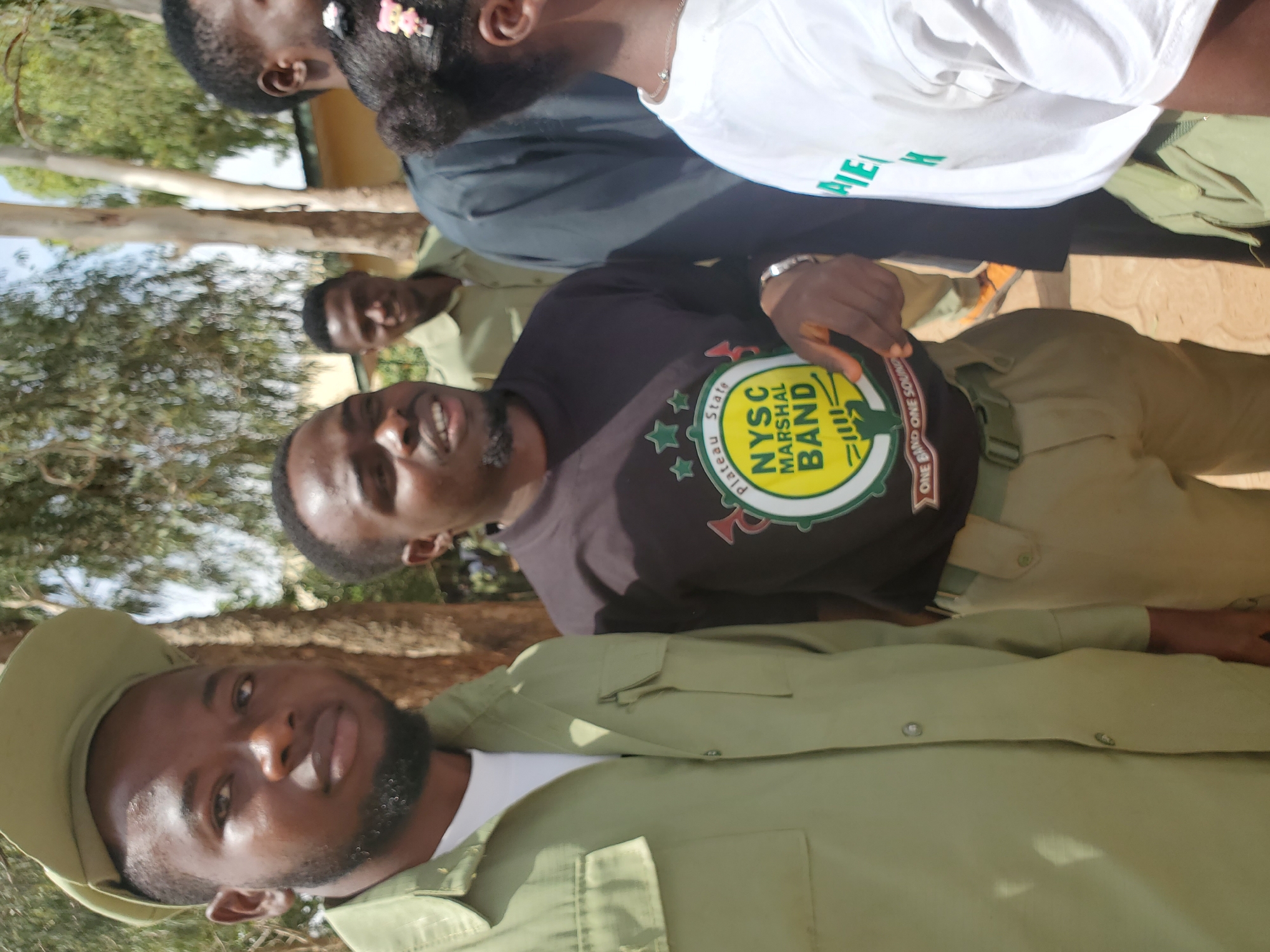 This image depicts a group of individuals gathered outdoors, likely within an institutional or public setting in Jos, Plateau State, Nigeria, associated with the National Youth Service Corps (NYSC). In the left foreground, a dark-complexioned male with a light beard wears a light olive-green long-sleeved button-up shirt, consistent with the NYSC uniform, over a white undershirt, and a matching olive-green cap. He gazes slightly to his right. Centrally, another dark-complexioned male, also with a light beard, wears a black long-sleeved t-shirt featuring a circular logo that reads "Plateau State NYSC Marshal Band" with a graphic of a fist holding drumsticks and the slogan "ONE BAND ONE SOUND." He wears light olive-green trousers and a silver watch on his right wrist, and is pointing his right index finger forward and slightly downward. He has a partial smile and looks slightly to his right. To the immediate right of the central figure, the upper back and side profile of a person, likely female, is visible, showing dark hair adorned with pink decorative clips and a white t-shirt. Further right, a partial view of a dark-complexioned male in a dark blue or black collared shirt is visible. In the mid-background, to the left of the central figure, a third dark-complexioned male in a light olive-green button-up shirt smiles and looks towards the right. The background features several trees with sparse green foliage, suggesting an outdoor, possibly dry environment, under bright daylight. A light-colored building is partially visible in the mid-background. The ground appears to be light brown soil or dirt.