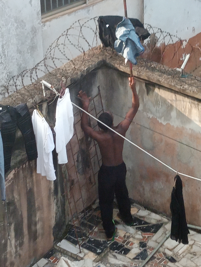 A shirtless man, seen from behind, reaches with a pole toward hanging clothes on a rooftop. His black pants are visible and he is standing on patterned tiles. A clothesline stretches horizontally across the scene, supporting additional clothing. Above, the rooftop is edged with barbed wire, and various pieces of clothing hang in the background, secured to the wire. The building's aged exterior is marked by varied textures and color patches.