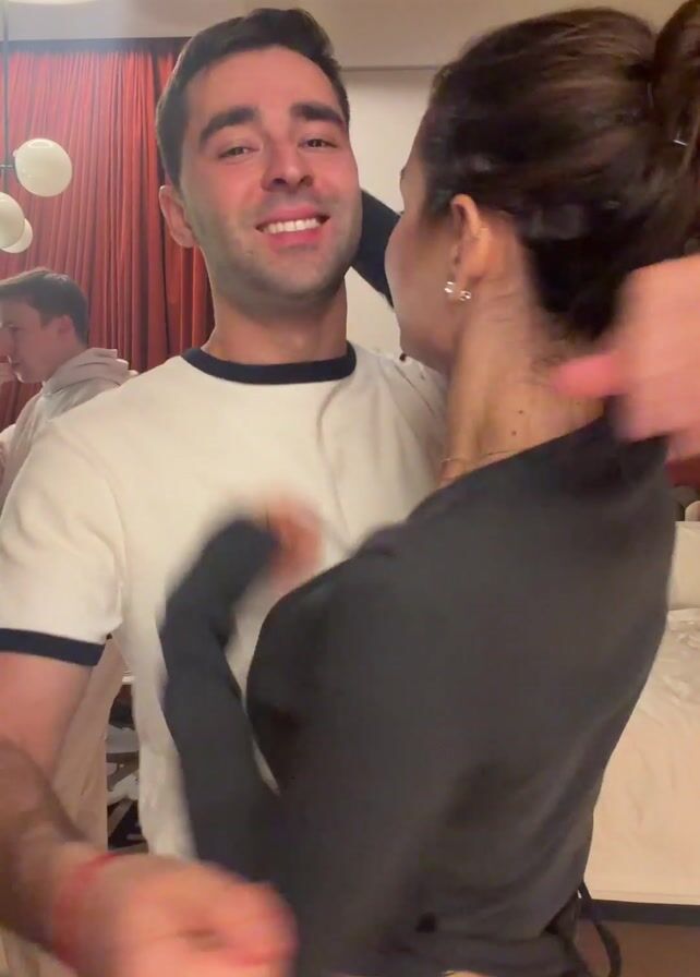 A fair-skinned woman with dark hair in a high bun wearing a gray long-sleeved top kisses a fair-skinned man with short brown hair who is wearing a white t-shirt with navy trim around the neck and sleeves. The man hugs the woman tightly as they kiss. A red bracelet is visible on the woman's left wrist, and a blue watch is visible on the man’s left wrist. In the background, a third person, a man with light hair and wearing a cream-colored hoodie, stands near a curtain and a table with glasses on it. A chandelier hangs from the ceiling, and a bed is partially visible in the background. Music plays throughout the video.
