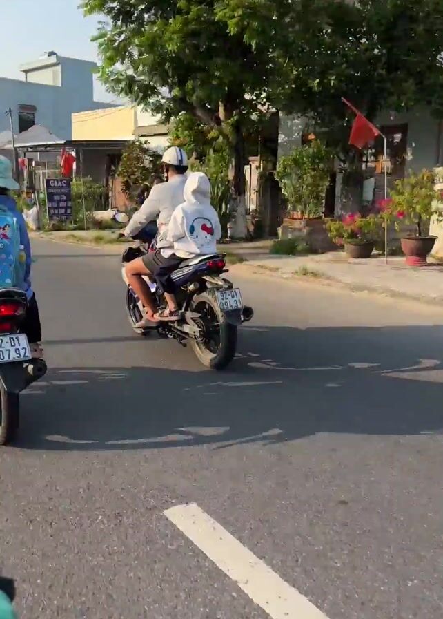 group of motorcycles driving down a paved road in what appears to be a residential area. The road is slightly uneven and has some patching. The first motorcycle has two people riding, with the person in the back wearing a light blue backpack and a bucket hat. The second motorcycle also has two people; the rear passenger is wearing a white hoodie with a Hello Kitty design. The third motorcycle has two people and is smaller, red in color. Buildings and greenery line the sides of the road. In the background, there are houses with various colors and designs. A Vietnamese flag is seen waving. The overall setting suggests a sunny, calm day in a Vietnamese neighborhood.