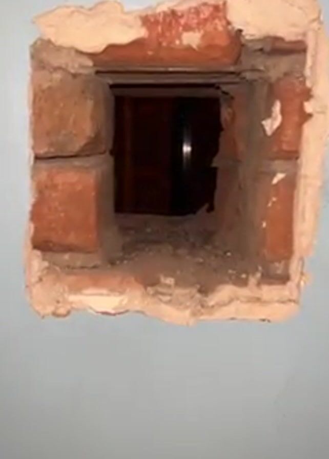 square hole in a wall made of red brick and plaster. The hole reveals a dark space with a brick interior and some loose debris on the bottom. A metallic pipe or object is faintly visible in the background. The wall is painted a light blue color. The camera zooms in to show more detail.