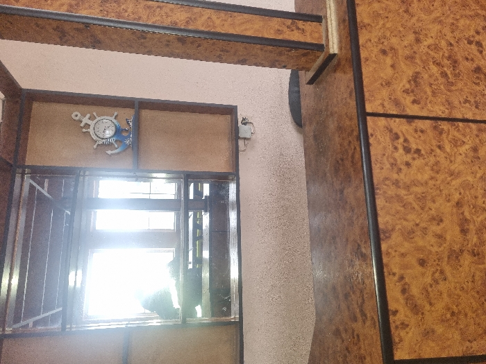 This image, taken in the city of Ovcharovo, Bulgaria, depicts an interior space featuring a prominent mirror reflecting an outdoor scene and a human figure