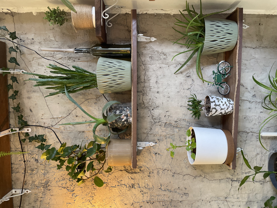 - "This image, located in Batumi, Georgia, displays an indoor wall adorned with two dark-stained wooden shelves holding various potted plants and decorative items" by FM-HSuMn2, licensed under CC BY 4.0