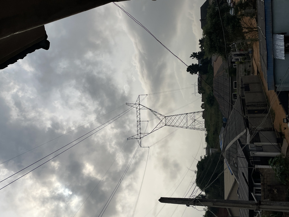 A cloudy sky dominates the scene, with overhead power lines and a metal electrical transmission tower in view. Lower in the image, roofs of buildings and foliage are visible. The photo is oriented at an angle, with the sky appearing on the left and the buildings and foliage on the right. Overall, the image captures an urban or suburban landscape on a cloudy day.