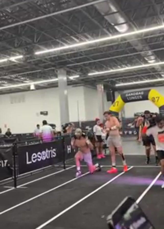 line of men participating in a competition that involves lunges while carrying a sandbag on their shoulders. The men are on a black running track, divided by white lines. Above them is a high, white ceiling with exposed metal beams and industrial lighting. A banner reads “SANDBAG LUNGES.” The event appears to be sponsored by Lesotris and Hyrox. Some spectators are visible in the background.