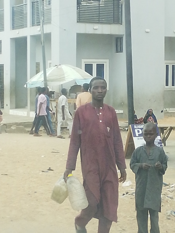 An outdoor scene in Hotoro South, Nigeria, depicts several individuals on an unpaved, dusty street. In the foreground, an adult male, wearing a maroon long-sleeved tunic with a buttoned placket, walks towards the left, carrying two clear plastic jerrycans, one containing a yellowish liquid, in his right hand. He looks directly forward. To his right and slightly behind him, a young boy with a shaved head stands, wearing a dark grey tunic and trousers, looking slightly downward with his hands near his waist. In the midground, to the left of the main figures, several other people are walking or standing, including two individuals walking away from the camera, one in a pink shirt. Further back, under a striped white and light blue umbrella, a vendor stall is visible with multiple people gathered around it. To the right of the boy, a wooden A-frame sign, partially obscured, displays "ALHAM... P... SERVI..." text. Behind the sign, two women are seated on a low platform or bench. The background features light-colored, multi-story buildings with dark-framed windows and horizontal slatted elements. A dark utility pole stands vertically in the mid-right. The ground is a light brown, unpaved surface with visible debris.