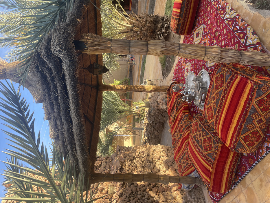 A shaded outdoor seating area displays colorful patterned cushions and a silver tea set on a rug. The seating is nestled beside a rock formation, with a thatched roof and palm fronds providing shade. A sandy pathway leads away from the seating, lined with palm trees and greenery, under a bright blue sky. The structure's materials and setting suggest a desert or arid climate.