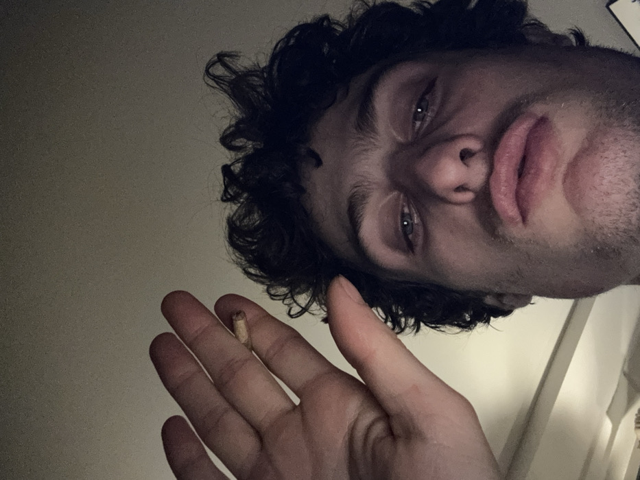An upward-angle selfie-style photograph captures a young adult male in an indoor setting within Vincennes, France. The male, positioned centrally, has dark, curly hair and a light mustache with stubble. His eyes are partially lidded, and his lips are pursed in an exaggerated manner. His left hand is raised to the upper left quadrant of the frame, with a hand-rolled cigarette, featuring a visible filter, held between his index and middle fingers. The background consists of an undifferentiated light-colored ceiling or upper wall. The scene is dimly lit, suggesting an artificial overhead light source.