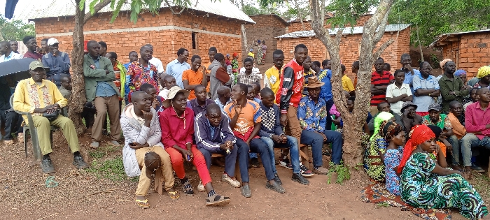 An outdoor gathering in Fizi, Democratic Republic of the Congo, depicts a diverse group of approximately 60-70 individuals, primarily adults and young adults, assembled on reddish-brown dirt ground with sparse green vegetation