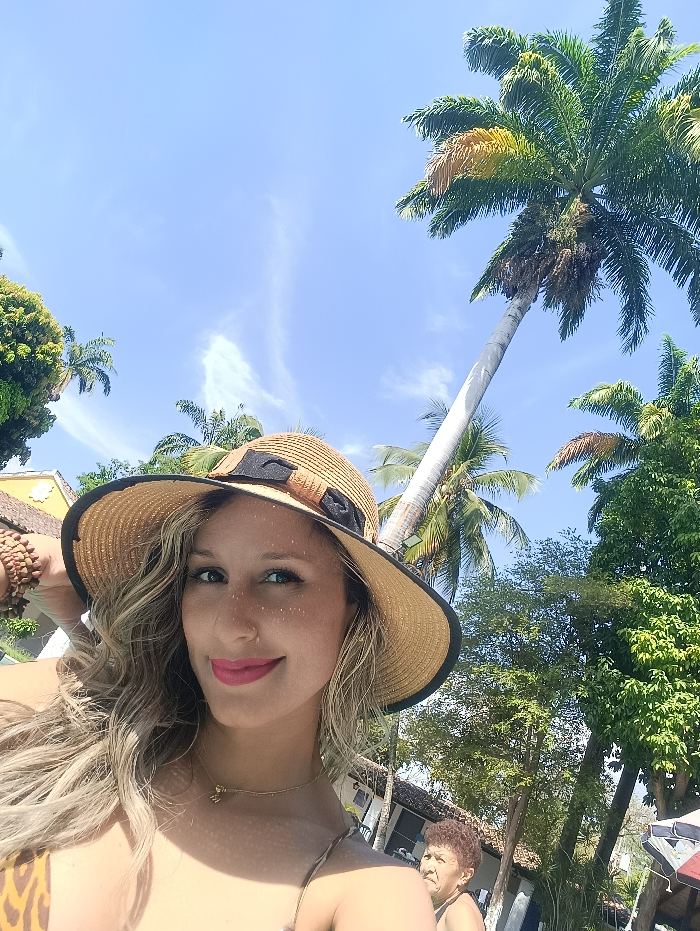 A female subject is depicted in a close-up, upward-angled outdoor portrait, looking directly at the camera with a slight smile. She has light-colored, wavy hair and wears a wide-brimmed straw hat with a black band and bow. A leopard print garment is visible on her torso, along with a thin gold-colored necklace. Her left forearm is partially visible, adorned with multiple brown, spherical beaded bracelets. A small stud nose piercing is present. The background consists of a bright blue sky with faint cirrus clouds and numerous green palm trees and other foliage, indicative of a tropical environment. In the mid-ground, partially obscured white or light-colored buildings with dark roofs are visible. To the right of the main subject, the head and shoulders of an older individual with short, curly, reddish-brown hair are partially visible, looking towards the left of the frame. The scene is brightly illuminated by natural sunlight. The location is La Victoria, Venezuela.