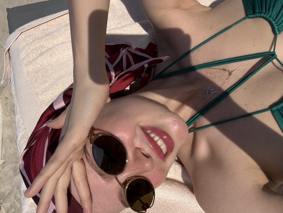 An overhead, sunlit close-up depicts a female individual reclining outdoors on a light-colored, textured towel. She is wearing a dark green halter-neck bikini top, round, gold-framed Miu Miu sunglasses, and a maroon and light-patterned Armani headscarf. Her left hand is raised with splayed fingers, shielding her forehead from direct sunlight, which casts a shadow across her arm. She exhibits a broad smile with glossy pink lipstick. Two delicate necklaces are visible, one featuring a 'P' pendant. Light-colored sand is present in the background. A reflection in the right sunglass lens explicitly displays "ABU DHABI," indicating the scene is located at a beach or poolside area within Abu Dhabi, United Arab Emirates.
