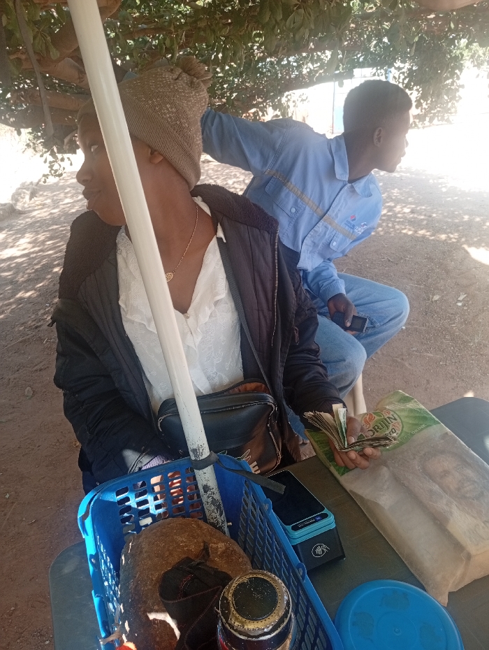 The scene is set outdoors in Barakin Sabawa, Nigeria, under the shade of a tree with green foliage visible overhead. The ground appears to be dirt. In the foreground, a female is seated, positioned with her left side towards the camera. She wears a brown knitted beanie hat, a white long-sleeved blouse, and a black jacket. A gold-colored necklace with a circular pendant is visible. Her left hand holds a stack of Nigerian Naira currency notes. A black shoulder bag rests beside her. A white vertical pole, possibly from a market umbrella or stand, is positioned directly in front of her, extending from the bottom of the frame upwards, with black tape or ties near its base. Behind and to the right of the female, a male is seated, facing towards the right, away from the camera. He wears a light blue long-sleeved work shirt with light brown stripes across the chest and arms, and light blue jeans. He holds a dark-colored smartphone in his left hand. On a dark-colored table or surface in front of the female, several items are arranged. A blue plastic basket contains a large, round, brown object (resembling bread or a stone), a small dark pouch, and a dark-colored container with a metallic lid. Next to the basket is a blue point-of-sale (POS) terminal. To the right of these items, a green and white plastic bag branded "ORIJIN BITTERS" lies on the table, containing several wrapped rectangular items. A round blue plastic lid is visible on the far right of the table. Sunlight filters through the tree canopy, creating dappled light and shadow patterns in the background.