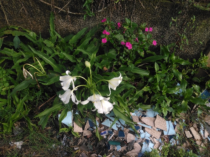 The image displays an overgrown outdoor scene, likely a garden bed or verge, against a textured, dark gray wall. In the center, a cluster of approximately five white flowers, consistent with a species of lily or spider lily, are in full bloom, featuring distinct white petals and prominent stamens. One unopened bud is visible above, and a single wilted, light brown flower or bud lies to the left. These flowers are surrounded by numerous long, sword-shaped green leaves. To the upper right, a patch of vibrant pink flowers, resembling Impatiens, is visible against the wall. The lower foreground is covered with scattered fragments of broken ceramic tiles, primarily light blue and beige, intermingled with soil, smaller debris, and various green foliage. The dark wall in the background exhibits a rough texture. The image does not contain any discernible architectural features, landmarks, or contextual elements that would allow for specific geographical identification within the city of Røros, Norway. No people are present.