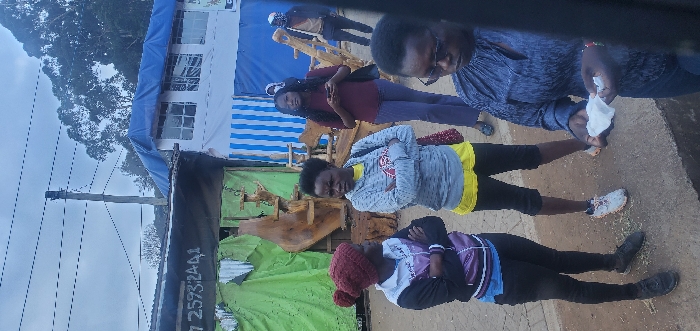 A group of four individuals stand outdoors near a building or structure with blue and white tarps. One person is holding a white tissue or cloth. The group is dressed in casual clothing, including jeans, sweaters, and jackets. A wooden structure or bench is visible behind them. The sky appears overcast, with trees in the distance. Electrical poles and wires are also visible in the background.