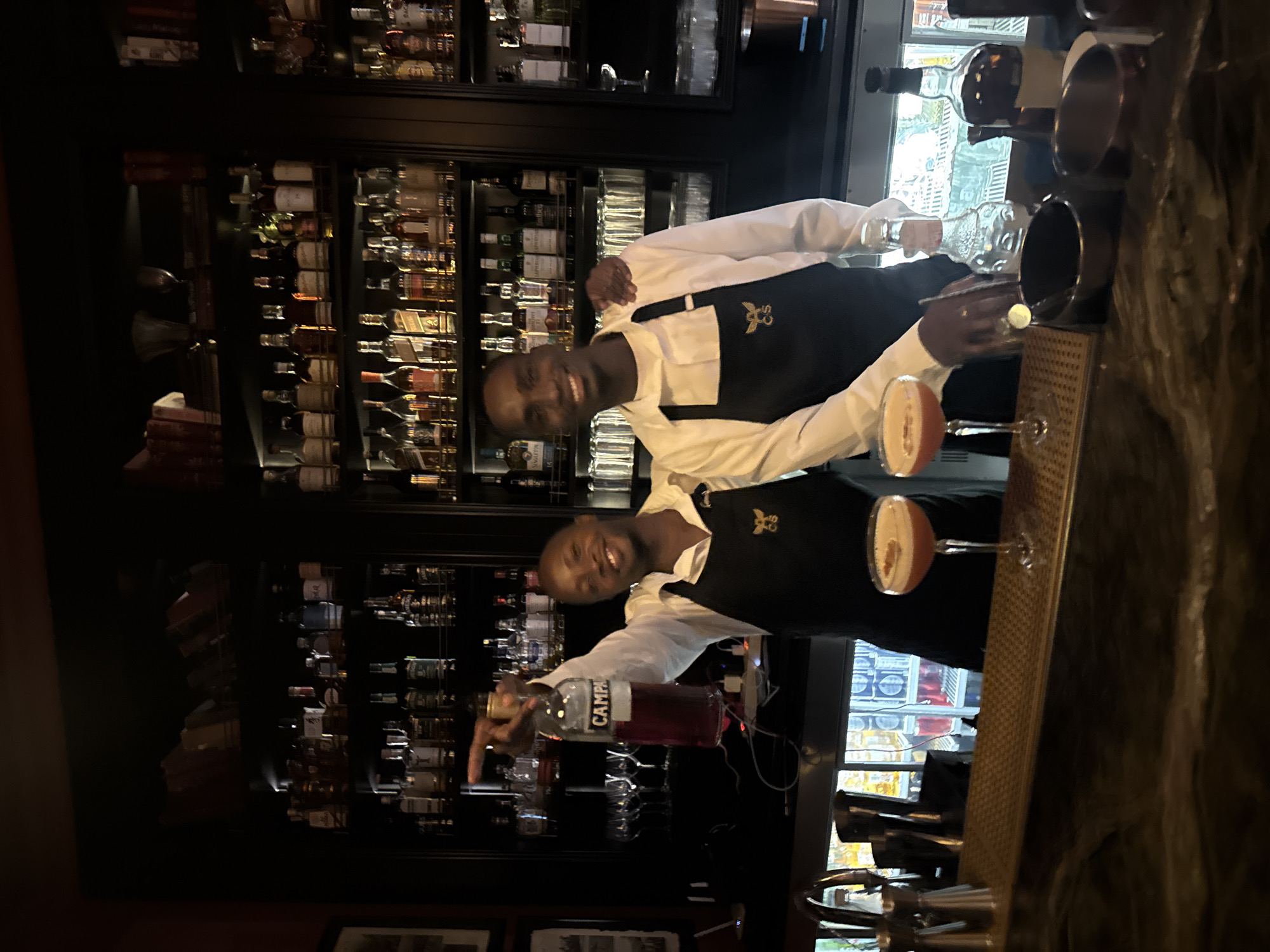 Two bartenders, in white shirts and black aprons, stand behind a bar. One holds a bottle of Campari. Both are smiling. In front of them are two cocktail glasses containing mixed drinks. Behind them is a well-stocked bar with rows of liquor bottles. The location is Cape Town, South Africa.