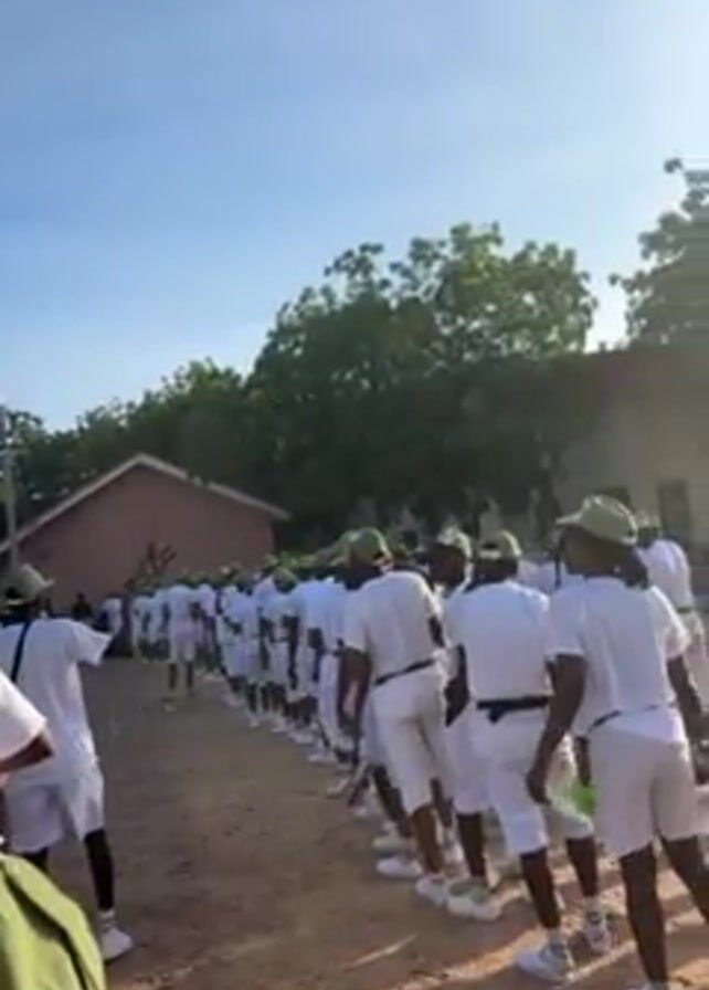 A large group of people, likely cadets or trainees, are standing in a long line outdoors on a dirt path. All are wearing matching white tops and shorts, white shoes, and olive green hats. Some have white sashes over their shoulders. The group is generally moving slowly in a line, although some individuals are walking freely. A building with a red brick roof is visible in the background, as are trees and a blue sky. The video is somewhat shaky and appears to be taken from within the group.
