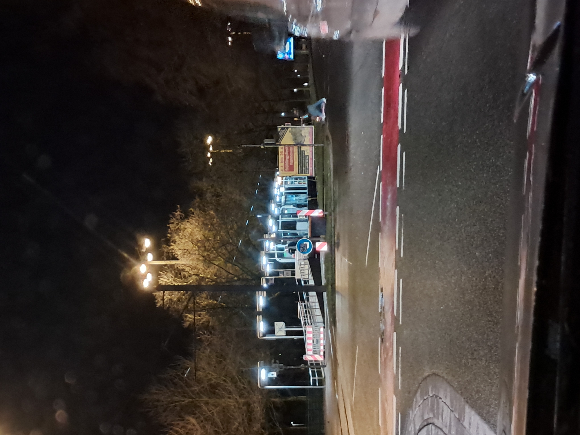 The image depicts a nighttime scene on a street in Hanover, Germany. The view appears to be from inside a vehicle looking out towards a street with a red-and-white striped bicycle lane. Streetlights illuminate the area. Trees line the left side of the road, their branches silhouetted against the dark sky. Further down the street, there are parked trucks or vans, construction barriers, and road signs indicating a construction zone. A person is present next to the construction site. The atmosphere suggests a damp, possibly rainy night.