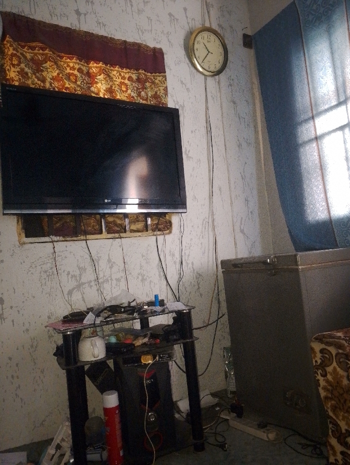 An interior displays a wall-mounted LG television above a cluttered black glass shelf unit. An ornate fabric piece is draped above the TV. A round, gold-framed clock hangs on the wall to the right of the TV. To the right, a freezer stands next to a patterned sofa. The room is illuminated by daylight filtering through a blue curtained window. The wall has a textured, off-white finish.