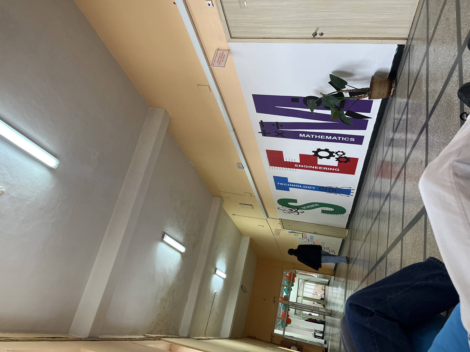 The image depicts an indoor hallway or corridor with fluorescent lighting on the ceiling. Along the wall, there is a sign displaying the acronym "STEM," with each letter standing for a different field: Mathematics, Engineering, Technology, and Science. There is a person in the background, walking towards the end of the hallway. To the right of the sign, a person's legs are visible, suggesting someone is seated nearby. The floor is tiled with a checkered pattern. The image was taken indoors at Pernik, Bulgaria.
